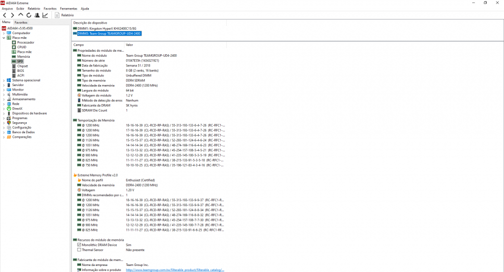 Eae pessoal, venho tendo problemas de performance no meu Pc, mas não tenho certeza do que é, comprei faz pouco tempo e logo que comprei ja adicionei um ssd e mais um modulo de memoria ram, porém esse modulo e de marca diferente do que ja veio com o pc, porém com a mesma frequência. O problema é o seguinte, o computador em varios jogos e as vezes até alguns programas da uns gargalos, uns travamentos chatos(por ex: Chrome,Discord,etc...) em jogos ele congela de 4 a ate uns 8 segundos e volta, de jogos pesados até mais leves, até agora não consegui identificar o que seja por que sou leigo nessa parte. Baixei o Aida64 pra ver se as memorias tinham alguma diferença entre elas, e acabei achando uma que não sei o que significa, mas estarei deixando prints das memorias e da config do pc. Não entendo se essa maior variedade de temporização de memoria pode afetar em algo. Intel Core i5-8400 ASUSTeK COMPUTER INC. TUF H310M-PLUS GAMING/Br NVIDIA GeForce GTX 1060 6GB SSD: KINGSTON SA400S37240G (223 GB) HD: TOSHIBA HDWD110 (931 GB) Windows 10 Pro 64bits
