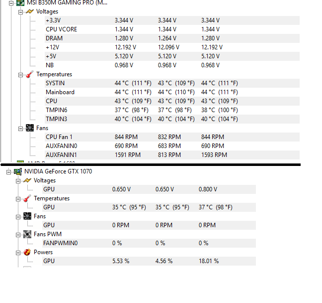 3. Fala galera, beleza? Então, até ontem estava tudo certo no meu PC, quando hoje estava jogando e reparei que algum fan estava em alta rotação. Primeira coisa foi conferir na BIOS, e estava tudo certo. Até tentei mexer as configs das fans (coloquei tudo no mínimo) e nada mudou.. Conferi o HWMonitor, estava aparentemente tudo certo. Pensei ser algum problema de detecção das reais velocidades, e abri o gabinete. Meu fan lateral, o cooler da cpu e +2 do gabinete estavam tudo certo. Foi então que percebi que o som vinha da fonte. Não é coil whine, mas sim um barulho de vento, bem forte. Ainda não abri a fonte para ver. O que será que pode ser? Print do HWMonitor (não é a GPU também(está em 0RPM pois uso uma curva de rotação no Riva para parar as fans quanto chega em uma certa temp)