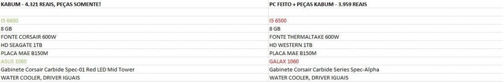 3. Olá, fiz umas pesquisas e comparei alguns preços e peças, aqui vai uma imagem comparando as peças: Os que estão escrito (feito), quer dizer que já vem montado, e os que estão sem esse "(feito)" quer dizer que vêm em peças separadas! Qual vale mais a pena? Me ajudem ae galera!!
