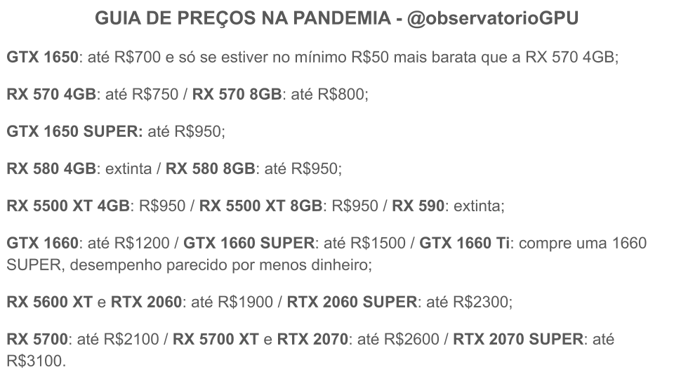 Apenas tome cuidado com essa de comprar em lojas separadas, porque talvez o que gaste com frete, será o que estará economizando nas promoções, e no fim, sai elas por elas. Boa configuração, porém, acredito que existam memórias mais baratas que as da Corsair que valem mais a pena. Uma 1650 super não está o mesmo preço que uma RX580? O desempenho é semelhante, e a placa é mais recente. Vou deixar uma imagem como base para ter uma noção dos preços antes da pandemia. -