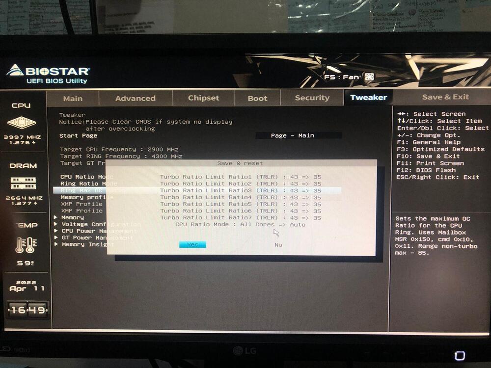 Boa tarde guerreiros alados. Estou tendo problemas com o meu i5-10400F. O rapaz em questão não alcança o turbo boost em nenhum dos Cores, pois como deveria ser, pelo menos um deveria estar em Boost de fábrica. O multiplicador fica travado em 35.0 em todos os Cores, e pela placa-mãe eu encontrei o Ratio Limit do CPU, inclusive setei ele pra 40.0 pra ver se resolveria. RESULTADO: acabou ocorrendo Boost em TODOS os cores, não somente em um (o que eu não queria, pois aumentou muito a temperatura). Em resumo, alguém saberia me dizer se é possível corrigir esse problema e setar somente um dos cores para turbo, sem alterar o demais? SETUP: .placa-mãe BIOSTAR h510mhp; .2X8 DDR4 Kingston Fury 2666; .Intel Core i5-10400F .GTX 750 2gb SC .Fonte EVGA 600W 80pb 1° Imagem: ele em 100% sem ocorrer o Boost em nenhum dos cores; 2° Imagem: o local onde tentei alterar o multiplicador de somente um dos cores, mas se aplicou para todos -