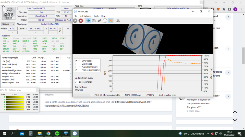 Aqui está o resultado do teste de stress utilizando o HeavyLoad. 100% de uso do CPU mas a frequencia ainda em 3.5 com 35.0 de multiplier. -
