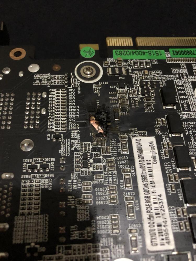 13. Galera, não sei se é aqui que eu posto isso, se não for me desculpem. Então, eu tava de boa jogando quando de repente a tela ficou preta, saiu uma fumaça e logo o fogo na placa. É uma GTX 1070. Não sei dizer o motivo se as ventoinhas pararam de funcionar e superaqueceu ou vazou liquido do meu water cooler nela. Tirei uma foto de onde foi o estrago. Poderiam me dizer se possivel o que houve?