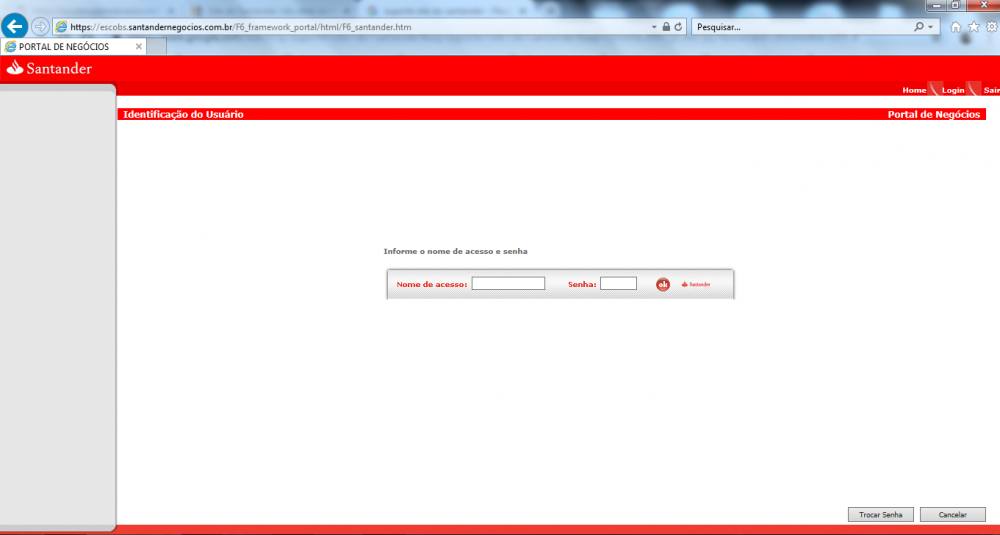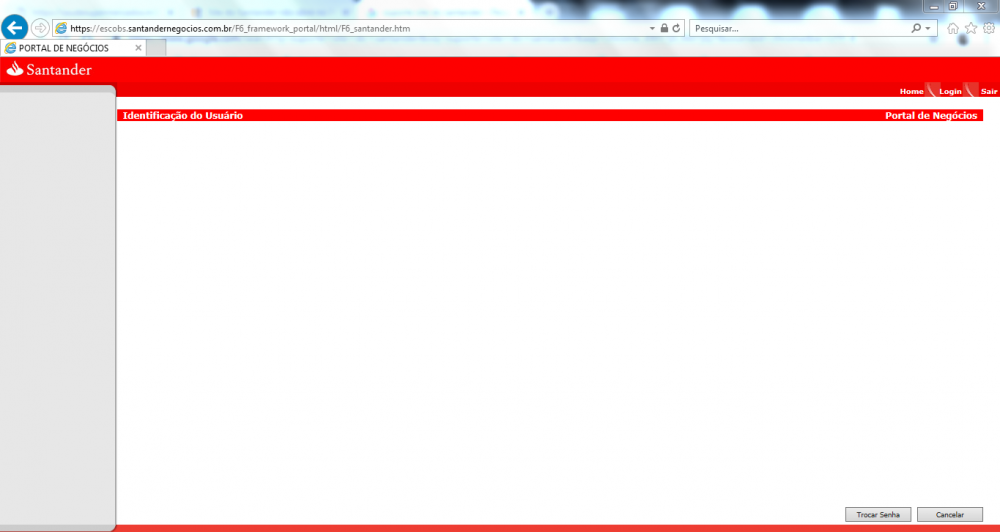 Primeiramente bom dia, estou com problemas para acessar o site do Santander Negócios o link é Santander Negocio, quando eu clico na opção login aparece " Deseja iniciar com outro usuário? " e simplesmente não ocorre nada(acredito que apareça alguma tela de login mas não está aparecendo), quando clico no botão Home aparece " Por favor informe o usuário " , eu clico em " OK " e rapidamente aparece uma tela de login mas ela some logo em seguida, essa telinha de login fica apenas alguns milésimos de segundo visível, consegui tirar print da tela de login , mas ela não fica visível para ser preenchida. Alguém pode me ajudar? procurei sobre o assunto e existem fóruns falando sobre problemas para acessar esse site só que relacionados a plugins do Google Chrome, mas não achei nada referente a Internet Explorer, eu utilizo o O.S Windows 7 Enterprise , estou tentando acessar pela navegador Internet Explorer. Obs: No Google Chrome nem consigo acessar esse site, mas utilizamos mesmo no Internet Explorer, se conseguir acessar por outro navegador sem problemas mas ja testei no Chrome e no Firefox não funciona. Segue anexo o print da tela de login que fica visível só por alguns instantes, e também o print da tela que fica pra mim (em branco).