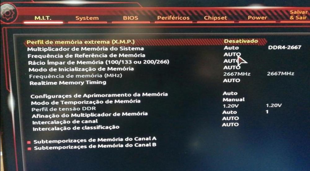 Olá, boa tarde. Eu montei um PC pra um amigo e está tudo perfeitamente bem, tirando o fato de que mesmo ativando o perfil XMP a memória continua no clock base 2400 e não vai pra 2666 que é a frequência máxima suportada pelo cpu dele e Tb da memória. A placa-mãe dele é uma H310 (print anexo) e estou usando um i3 9100f, memórias são da crucial Ballistix (print anexo) 2x8 16gb 2666. Minha placa é B360 aorus gaming 3 e nela se não me engano eu so ativei o perfil XMP e foi pra 2666, na dele mesmo ativando não foi. Não sei muito de bios e preferi não mexer em outras coisas. Se tiver algo que eu tenha que fazer a mais me avisem, também se precisar de print a da tela da bios.. Obrigado