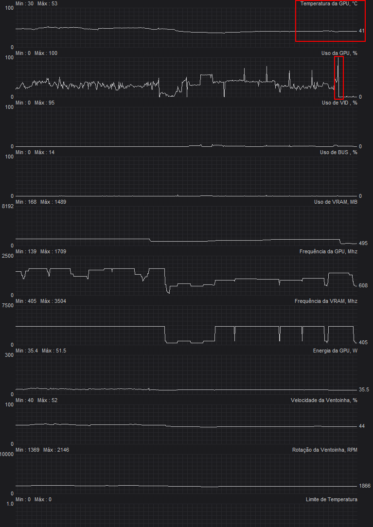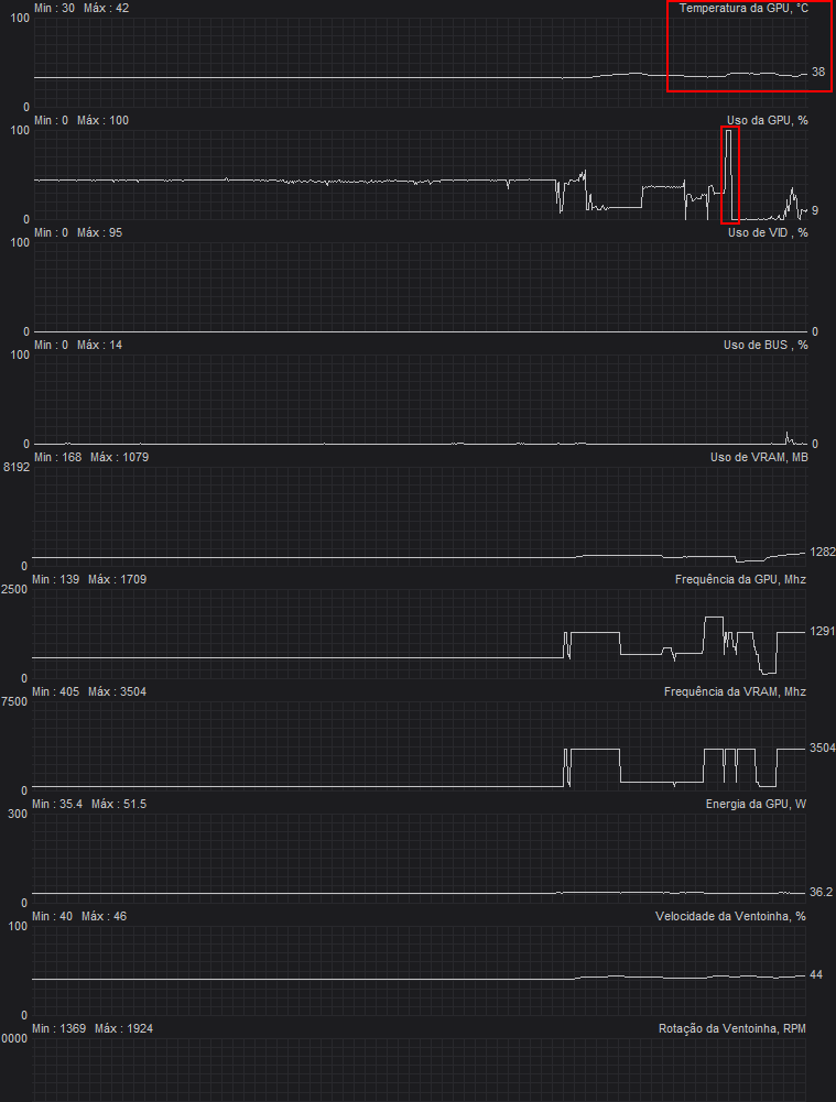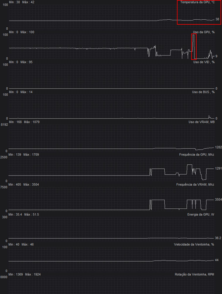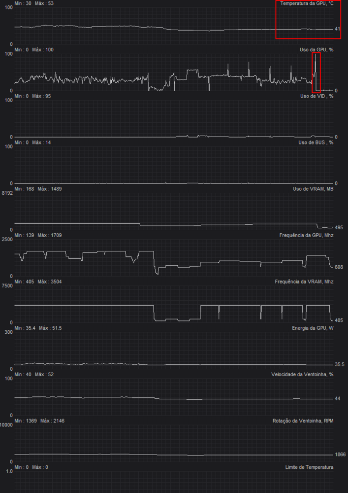 4. Bom dia. Eu não sei exatamente o que tá acontecendo com meu computador, mas vou tentar resumir. Esse é meu setup: GTX-1050TI. Core i3 10100-f. Gigabyte H410M-H. 8GB HyperX x2. ADATA SSD 150GB. Fonte real 450w. Meu processador não tem vídeo integrado, então o vídeo do meu computador vem inteiramente da placa de vídeo. De uns meses pra ca, após uma atualização de drive, minha placa de vídeo começou a desligar sozinha, travar realizando funções que ela fazia normalmente antes, tipo, jogando lol, e até mesmo abrindo o navegador. Eu cheguei a cogitar que era o drive, então desatualizei o drive mas o problema persistiu. Então eu pensei que pudesse ser limpeza ou alguma conexão errada, então eu limpei o computador inteiro por dentro, desconectei, limpei as entradas, os contatos, montei de volta, mas o problema também persistiu. Pedi ajuda, vi alguns videos, talvez pudesse ser superaquecimento, então eu troquei a pasta térmica, mas o problema continua, e pra piorar, de uns tempos pra ca ela passou além de travar, apresentar artefato. Eu fiquei monitorando então através de alguns programas pra tentar identificar o que poderia ter sido, e percebi através de uns gráficos que quando ela trava, desliga, da artefato e etc, ele dá um pico de uso em 100% do nada, depois volta ao normal (às vezes n volta e eu tenho que reiniciar o computador), só que a temperatura se mantem a mesma, então eu acho que não é superaquecimento... mesmo assim, eu ainda não consegui descobrir o que tá fazendo isso com ela, ou se o problema realmente não é na placa de vídeo e sim em alguma outra peça... Os gráficos são esses, alguém tem alguma teoria do que pode ser?