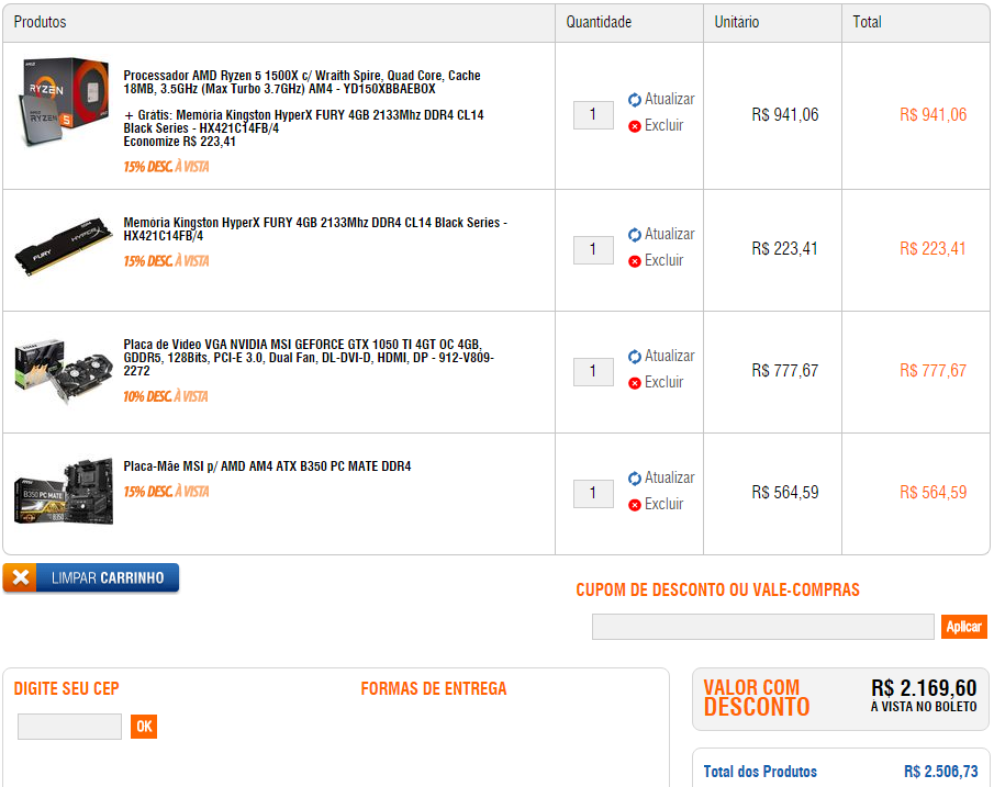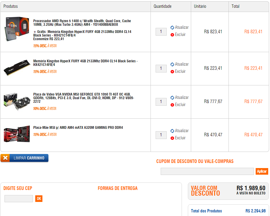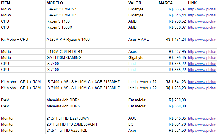 Estou querendo montar um PC pra uso médio, photoshop, alguns jogos como GTA V, Civilization VI e uns indies também que eu adoro! Já tenho fonte, HD e um gabinete antigo mas que dá pra usar. Pesquisando aqui no fórum em outros tópicos, fiz um esboço de configuração na Pichau, mas só pra ter uma base mesmo, peço que deem uma olhada