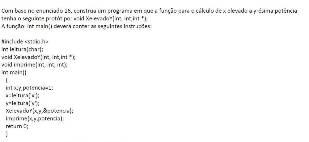segue abaixo o enunciado: adicionado 10 minutos depois referente a essa parte eu cometi um erro me desculpe,eu também tenho um programa q calcula apenas com expoentes negativos e ele estava aberto no momento e por falta de atenção calculei 2^-3 nele e acabei me equivocando.esse programa em questão calcula apenas com expoentes positivos. segue o código abaixo,adicionei um while para q não aceite expoentes negativos: #include <stdio.h> #include <stdlib.h> int leitura(char); int xelevadoy(int,int,int*); void imprime(int,int,int); int main() { int x,y,potencia=1; x=leitura('x'); y=leitura('y'); while(y<0) { printf("\nERRO!!ESTE PROGRAMA CALCULA SOMENTE POTENCIAS DE EXPOENTE POSITIVOS!!\n"); y=leitura('y'); } xelevadoy(x,y,&potencia); imprime(x,y,potencia); system("pause"); return 0; } int leitura(char x) { int y; printf("\n Digite o valor de %c:",x); scanf("%d",&y); system("clear||cls"); return y; } int xelevadoy(int x,int y,int *potencia) { int i; for(i=1;i<=y;i++) { *potencia=*potencia*x; } return *potencia; } void imprime(int x,int y,int potencia) { printf("\n %d^%d=%d \n",x,y,potencia); } -