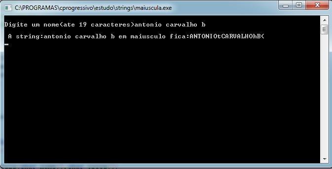 Fiz um programa que transforma letras minusculas em maiusculas,apesar de estar funcionando a impressao da string não está correta,imprimi como a foto em anexo,não imprimindo o espaço,o que faço para corrigir esse erro? #include <stdio.h> #include <stdlib.h> #include <string.h> #define TAMANHO 20 int main() { char nome[TAMANHO],troca[TAMANHO]; leitura(nome); maiuscula(nome,troca); getchar(); return 0; } void leitura(char nome[]) { int i; printf("\nDigite um nome(ate 19 caracteres)"); gets(nome); } void maiuscula(char nome[],char troca[]) { int i; for(i=0;i<TAMANHO;i++) { if ( (nome[i] >= 'a') && (nome[i] <= 'z') ) { troca[i]= nome[i]- 32; //nome[i] = nome[i]- 32;//quando eu fiz assim verifiquei que imprimia corretamente a string nome mas a troca sempre fica estranha,mesmo dessa forma dando certo queria //verificar como seria o jeito correto ultilizando a string troca,já que essa foi a minha priomeira ideia e não achei o erro } } printf("\n A string:%s em maiusculo fica:%s \n",nome,troca); }