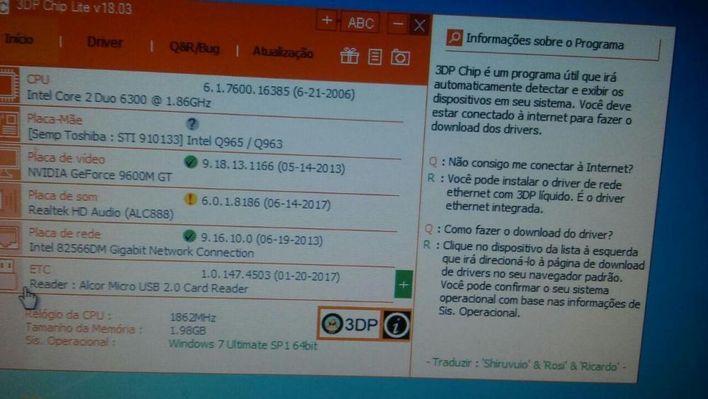 2. Usei todos esses ai e o único que achou foi o 3DP Chip e mesmo assim ele identifica a placa de vídeo como 9600M GT ou seja uma versão de um chipset de notebook segue imagens abaixo. Nem identificou a placa de vídeo rs assim como o driver booster e driver easy...