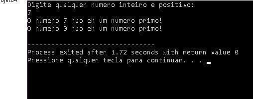 Boa tarde, Galera O programa está rodando, porém nos if's ele não identifica. Qualquer numero que eu coloque ele já vai para o if que diz que não é número primo. O que eu tenho que fazer e o que eu errei? /* Faça um programa com 2 funções, uma função será responsável por ler um número e garantir que esse número seja inteiro e positivo. A outra função identifica e imprime uma mensagem informando se o número é primo ou não.*/ #include <stdio.h> #include <stdlib.h> void ler_numero(); int imprime_numPrimo(int num); int main() { int num; ler_numero(); imprime_numPrimo(num); return 0; } void ler_numero(){ int num; do{ printf("Digite qualquer numero inteiro e positivo:\n"); scanf("%d", &num); } while (num <= 0); imprime_numPrimo(num); } int imprime_numPrimo(int num){ int i, aux; for (i = 1; i <= num; i++){ if (num%i == 0) aux++; } if (aux == 2){ printf("O numero %d eh um numero primo!\n",num ); } else{ printf("O numero %d nao eh um numero primo!\n",num ); } } Anexo como ele está saindo. Att,