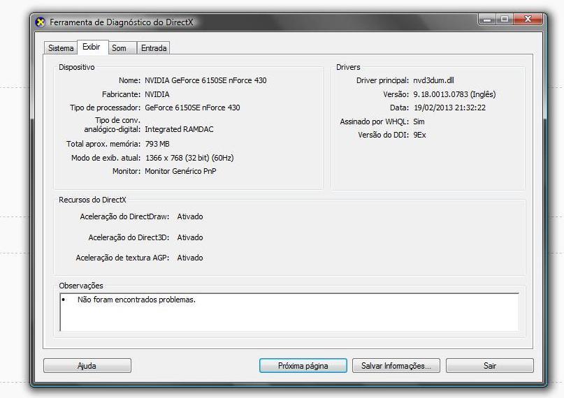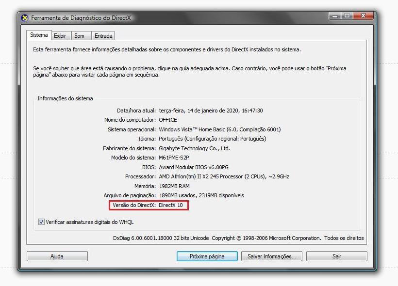 Boa tarde, Pretendo mudar o SO do meu computador. Atualmente, tenho um Windows Vista Home Basic (SP 1) e gostaria de atualizar para Windows 7 Ultimate. Olhando os requisitos no site da Microsoft, vi que meu computador atendia a 3 deles: processador (2,90 Hz, 32 bits), capacidade de armazenamento do HD (293 GB) e memória ram (2 GB), porém, na parte do Direct X, pede-se a versão 9 com driver WDDM 1.0 ou superior. Ao olhar o programa, vi que a minha versão é a 10 (em anexo, 01), mas a versão do WDDM não é mostrada (também em anexo, 02). Como posso verificar a versão do WDDM? Com o DirectX 10, será que eu consigo rodar o Windows 7? Já tentei rodar o Windows 7 Upgrade Advisor para ver se haveria incompatibilidade, mas o programa não conclui a verificação. Agradeço desde já pela ajuda.