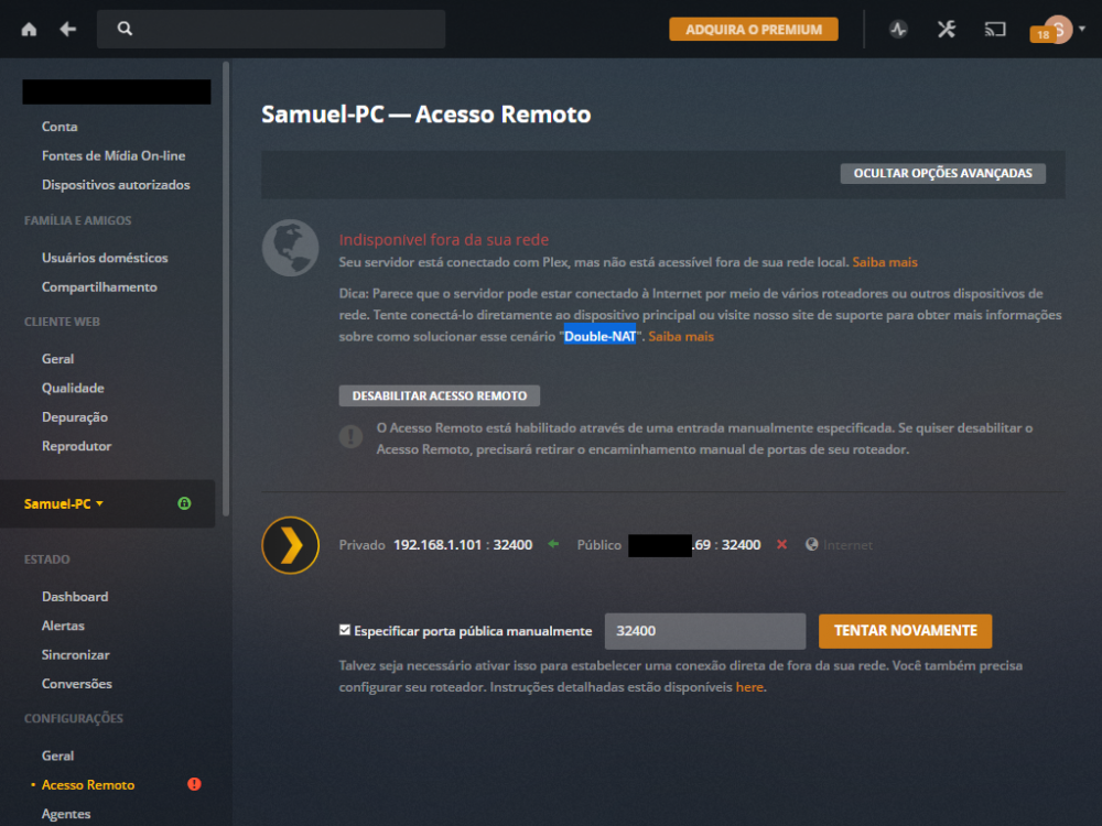 8. Estou usando meu PC como um media server com o programa Plex, ele funciona tanto na rede local quanto por acesso remoto, mas não consigo configurar o acesso remoto (mesmo com as portas liberadas no pc e no router), dá o erro ''Double-NAT'', já vi tutoriais no YT, configurei as portas manualmente, etc. Verifiquei no site http://whatismyip.host/ e o IP externo q aparece não é o mesmo q aparece na página de configuração do meu router, ou seja, existe um dipositivo entre meu router e a web q me impede de ativar o acesso remoto corretamente, o mais estranho é q aqui em casa não tem modem, apenas o roteador ligado ao PC via cabo. o que devo fazer?