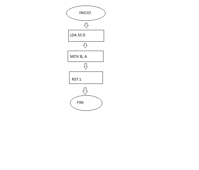 Boa tarde! Estou fazendo um exercício de um curso de eletrônica que estudo, e estou com duas dúvidas, a primeira, é se o que eu fiz na primeira questão está correto, e a segunda dúvida é como proceder na segunda questão... Se alguem puder me dar uma luz, ficarei agradecido. Segue as questões : 1 - Faça um fluxograma que some os valores 130EH e 102AH. Coloque o resultado no registrador A. 2 - Faça um programa em Assembly que coloque o valor 55D no registrador AX. Resposta para a primeira questão anexada. Desde já agradeço!