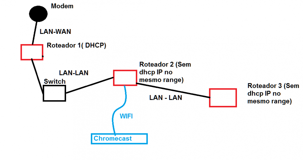 Boa tarde, Tenho 3 roteadores aqui em casa e gostaria de fazer com que todos dispositivos conectados via wifi possam ser vistos entre si, independente de qual Ap estiverem conectados. Fiz um desenho para ajudar, vamos as considerações: -Roteador 1 é o único com DHCP ligado; -Preciso de um switch entre o roteador 1 e 2 porque tenho 6 pcs conectados via cabo, todos eles se reconhecem na rede; -Roteador 2 e 3 com conexões somente na porta LAN e usando o DHCP do roteador 1; -Todos três roteadores tem dispositivos com conexões via wifi e cabeadas; -Consigo acessar todos roteadores do meu pc conectado no switch; -Todos roteador tem a mesma senha e a mesma SSID Problema 1: quando estou conectado ao roteador 1, não consigo ver o chromecast no celular e não consigo transmitir conteúdos para a tela pois ele está conectado ao roteador 2. Porém quando estou conectado ao roteador 3 consigo ver o chromecast normalmente. Problema 2: às vezes o chromecast conecta no roteador 1 e eu conecto no roteador 2, e aí também não consigo transmitir o conteúdo pro chrome. Novamente, quando conectado ao roteador 3 consigo ver ele normalmente. Alguém poderia me ajudar com o que deve ser feito? Muito obrigado