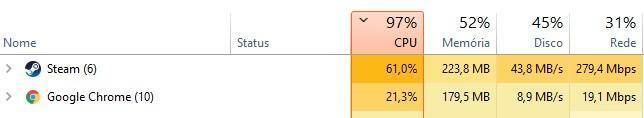 Olá amigos, há algum tempo que venho notado que meu computador com a execução de alguns programas (ex:Steam) e todos os jogos que abro fazem com que ele vá a 100% de uso da CPU. Quando isso acontece, nos jogos, o FPS cai drasticamente,por exemplo, estou com o Rainbow Six a 80 fps aí do nada cai pra 15,20 fica uns 10 segundos assim e volta ao normal. A temperatuda do processador fica na casa dos 60, 65 graus e da placa de video 55 graus. Vale ressaltar que enquanto os programas e jogos estão abertos não são em todos os momentos que ficam com 100% de uso de CPU. São só em alguns momentos!. Já testei um outro processador exatamente do mesmo modelo que o meu e acontece a mesma coisa. Alguém pode me ajudar? Obrigado desde já. Foto do gerenciador de tarefas:(OBS: na foto está 97% mas foi porque não consegui printar os 100% na hora) Máquina: Processador - AMD FX 6300 Placa-Mãe - ASUS M5A78L-M LX/BR Memória - 2x4gb Hyperx Fury 1866Mhz DDR3 Placa de video - NVIDIA GeForce GTX 1050 2GB Fonte - Corsair CX430W