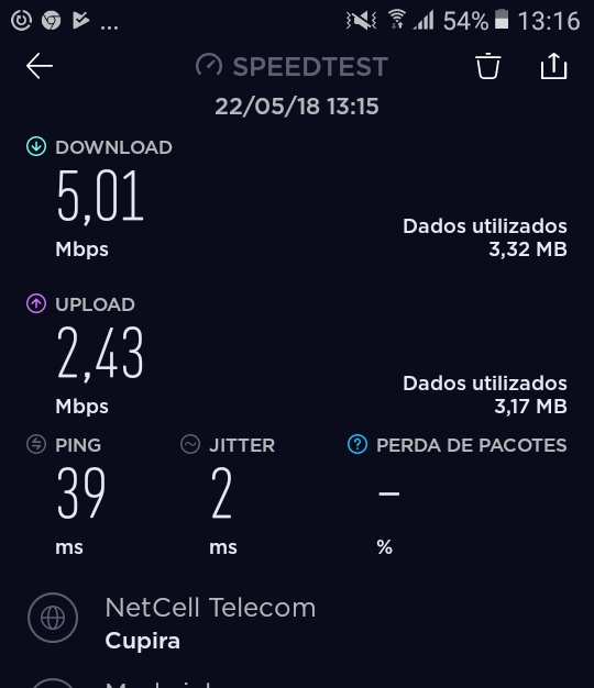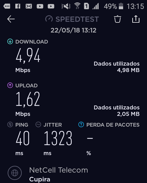 7. O jitter no meu celular esta muito alto, não é problema no wi-fi ate porque fiz alguns testes de velocidade e só no meu celular que dava alto, ate formatei so que ainda continua. A primeira foto foi o teste no meu celular, e a segunda em outro.