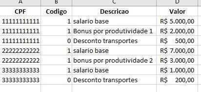 Nela, eu tenho vários codigos de pagamento de varios funcionarios(identificados por CPF); o pagamento é composto por varios penduricalhos(por ex, salario, bonus etc), sendo que o codigo 1 soma e o codigo 0 subtrai; no momento, eu pretendo somar somente os codigos 1 (não considerando os descontos). a planilha está anexa. Como fazer isso? Só lembrando que eu devo somar todos os penduricalhos do mesmo CPF e colocar o resultado dessa soma em uma linha da coluna (vide anexo).