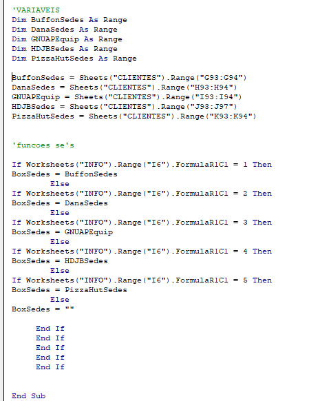 @osvaldomp Muito obrigado pelos ajustes! Esse método que de busca que sugeriu já havia visto, porém achei este que estava usando melhor justamente pelo motivo da praticidade como disseste mas se a solução dele é complicada vou implementar este form e depois retorno. Uma pergunta, no ambiente da planilha tem o If que chama o form e esse comando está vinculado a coluna em si. Mas e se eu tiver 2 ranges diferentes na mesma coluna, como mudar o If pra chamar a partir deles? Usando essa planilha que enviei, os ranges estão exatamente em B17:23 e B25:31. Também pretendo colocar apenas na célula B13 onde o usuário irá escolher o cliente mas estes tem os dados da lista localizado em outro local. Onde no código da form eu altero a origem dos dados de pesquisa? Desde já, obrigado. -